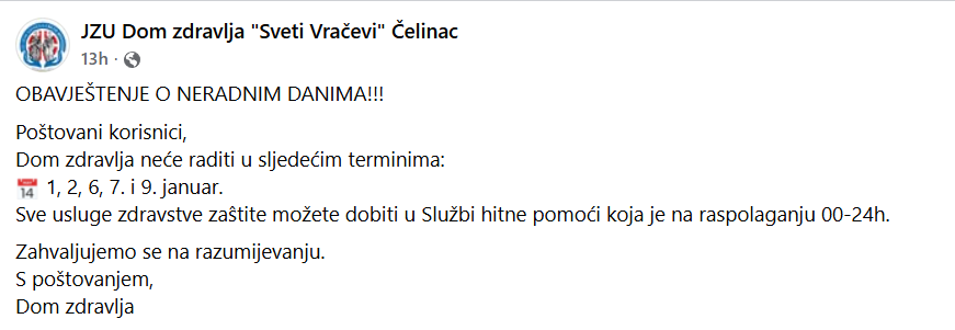 Овајештавамо све грађане општине Челинац да све информације у вези са вирусом корона могу добити сваког радног дана од 7:00 до 15:00 у хигијенско епидемиолоској служби Дома здравља Челинац на број телефона
